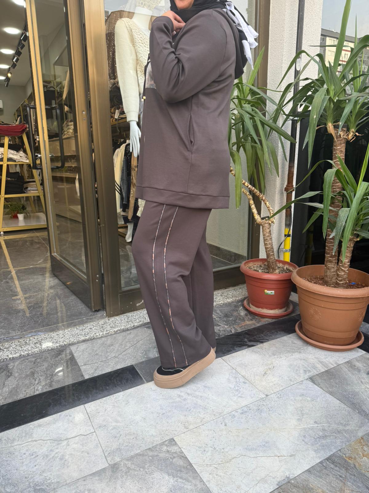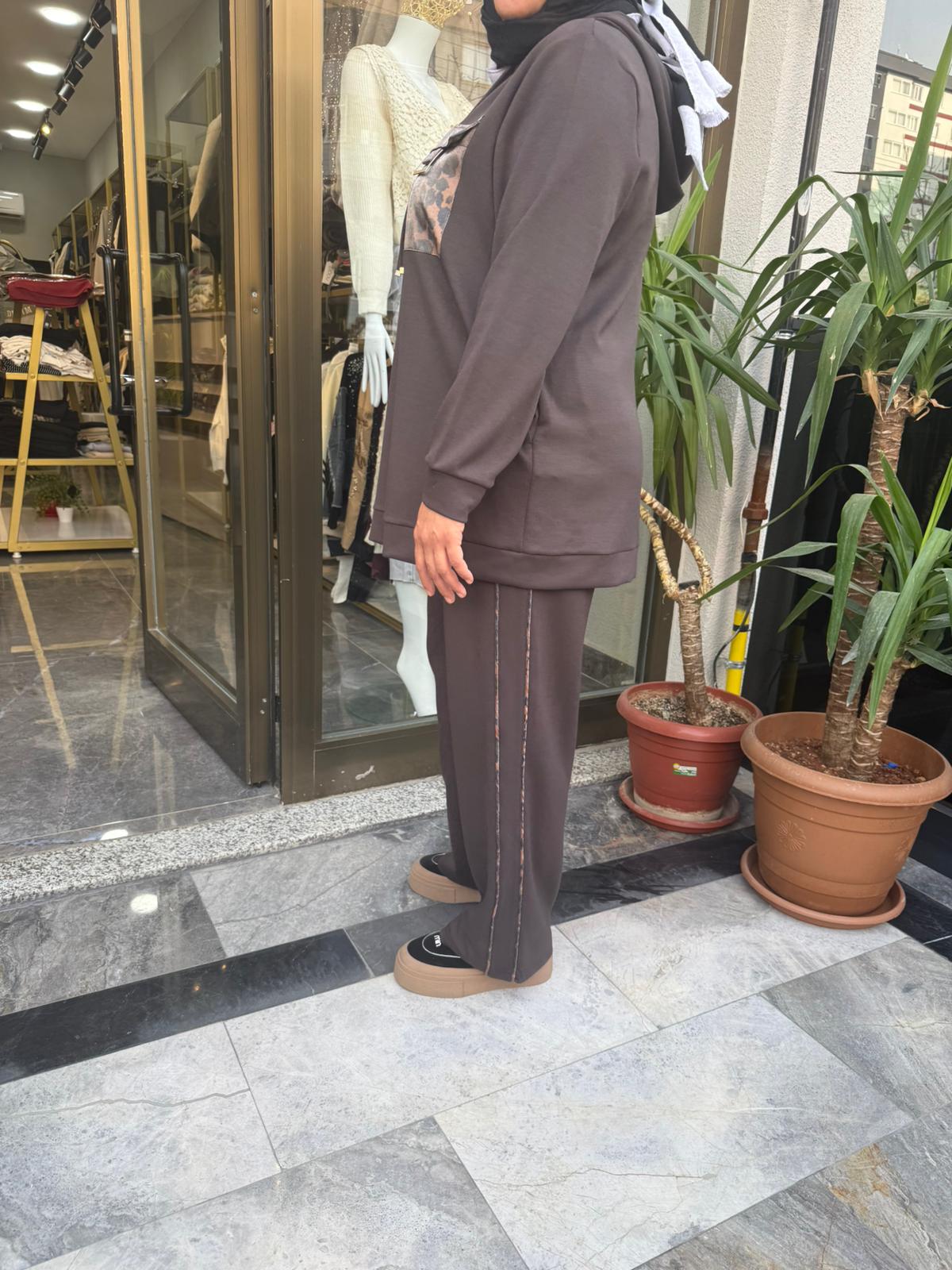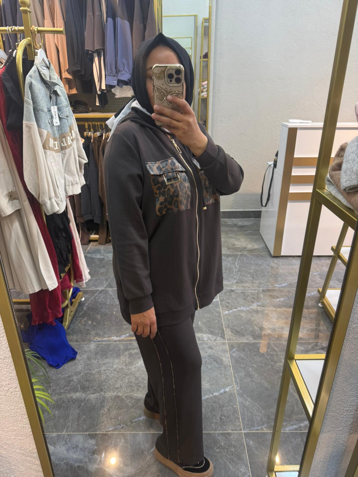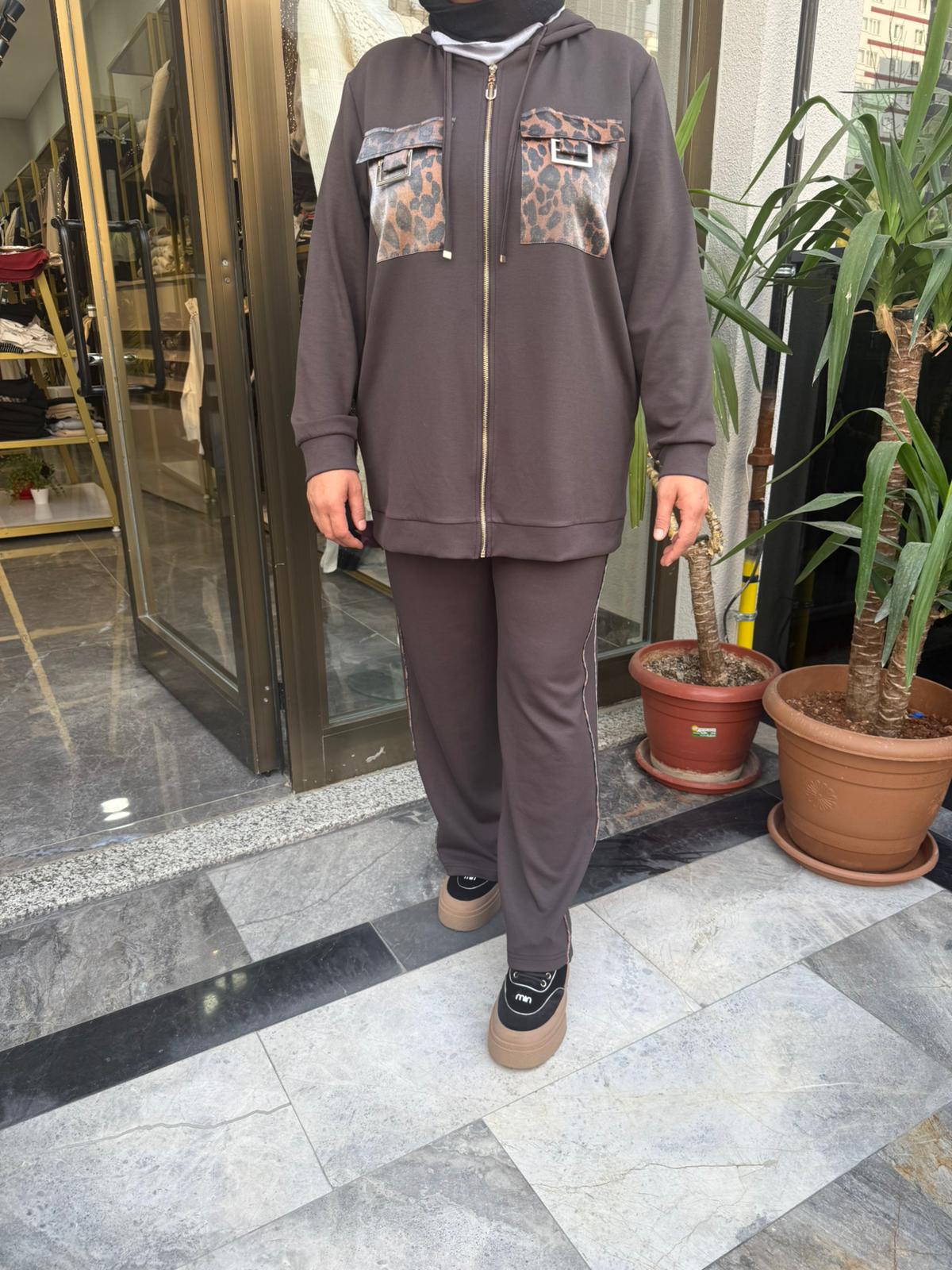 KAHVERENGİ CEP LEOPAR DETAYLI TAKIM