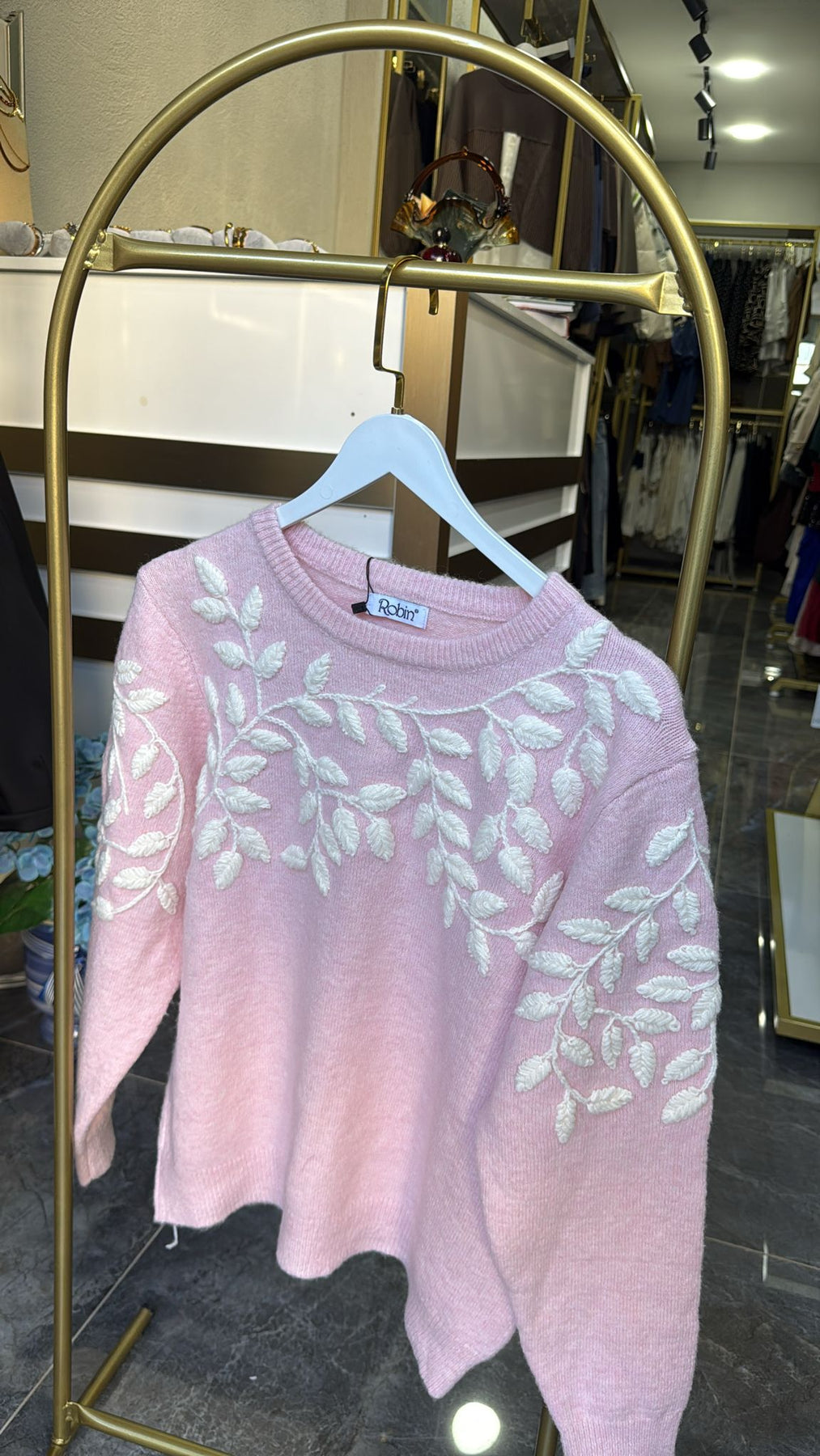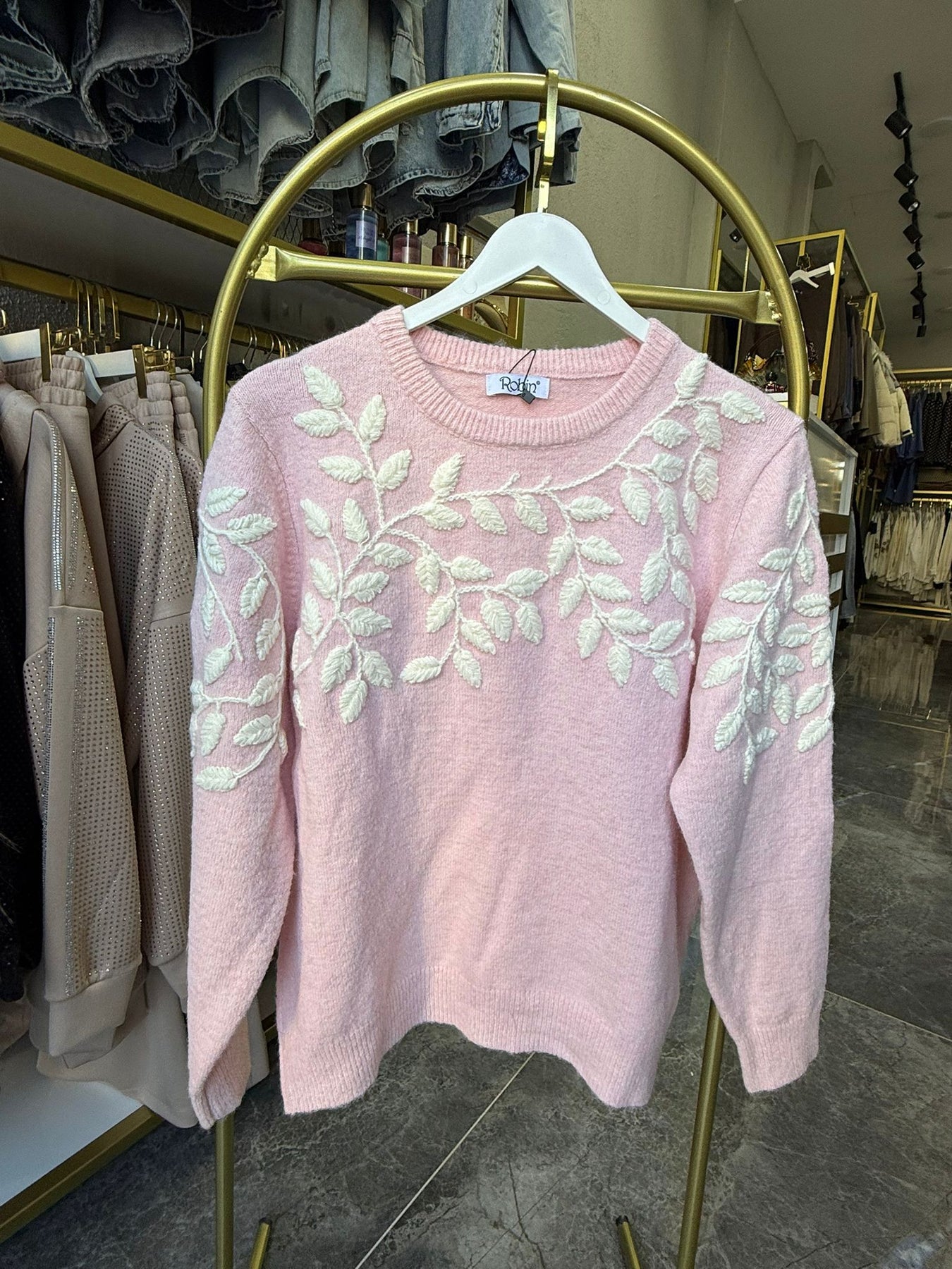 PEMBE YAPRAK DESENLİ YUMUŞAK KAZAK
